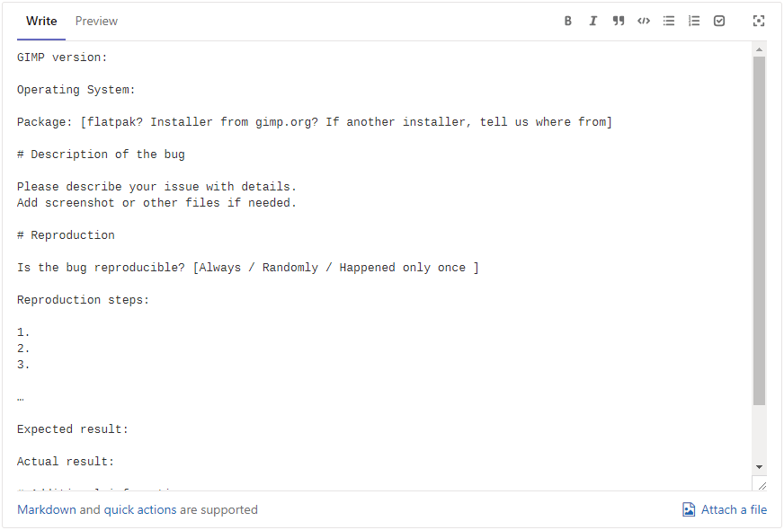 Making good bug reports is a great way to help increase the software quality of GIMP. A good bug report provides: